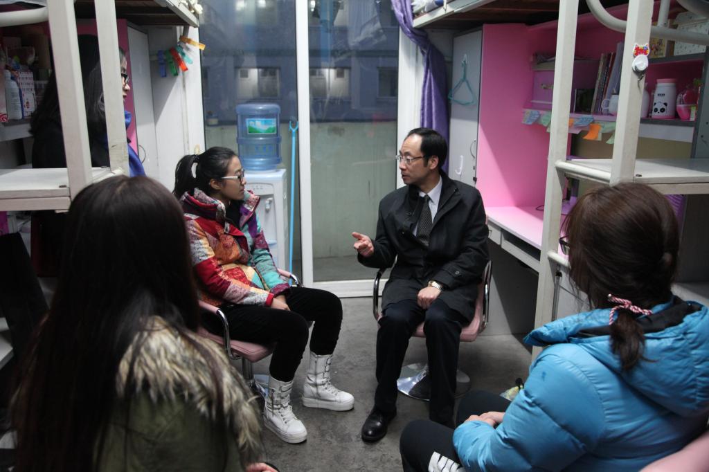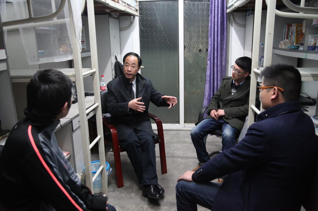 开学第一天傍晚,陈校长在学院党委副书记邵丽及学生公寓入住辅导员宋佳敏和詹文喜的陪同下,分别走访了本部公寓的部分女生寝室和男生寝室。陈校长到学生寝室后,亲切地询问寝室各成员基本情况,与同学们交流了寒假所见所闻、学校及周边基础设施建设情况、入党情况、就业情况、通识类课程设置及业余兴趣培养等话题;并就寝室热水供应、部分硬件设施老化等问题,认真听取同学们对学校各方面的建议和意见,鼓励同学们多与院、校互动,以宁大的主人身份积极为学校建设谏言献策。