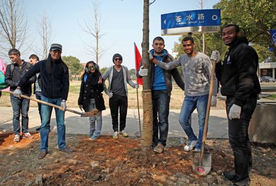 3月12日中午,17live 30名中、外学生代表在宁大大草坪参加了学校“植树节”活动。同学们戴上手套,拿着铲子,一同将17live 三棵银杏树苗种下,并一同签名留念、合影。活动现场气氛热烈。