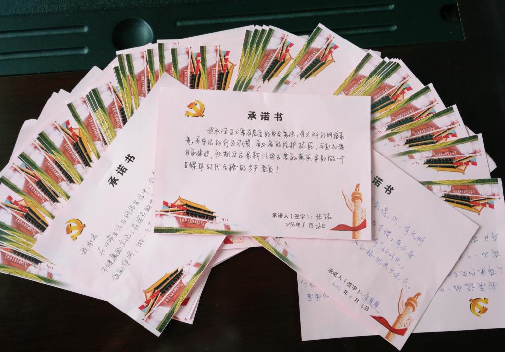 主题党课结束后,全体预备党员学员现场开展了承诺活动。每一位同学认真地在承诺书上亲笔写下属于自己的个性承诺,郑重地签上自己的姓名。他们纷纷承诺要在网络世界中发挥党员的先锋模范作用,正确引领积极的舆论导向,积极响应习近平的号召“做有高度的安全意识、有文明的网络修养、有守法的行为习惯、有必备的防护技能的新一代‘四有’好网民”,做一名自媒体时代下的合格共产党员。
