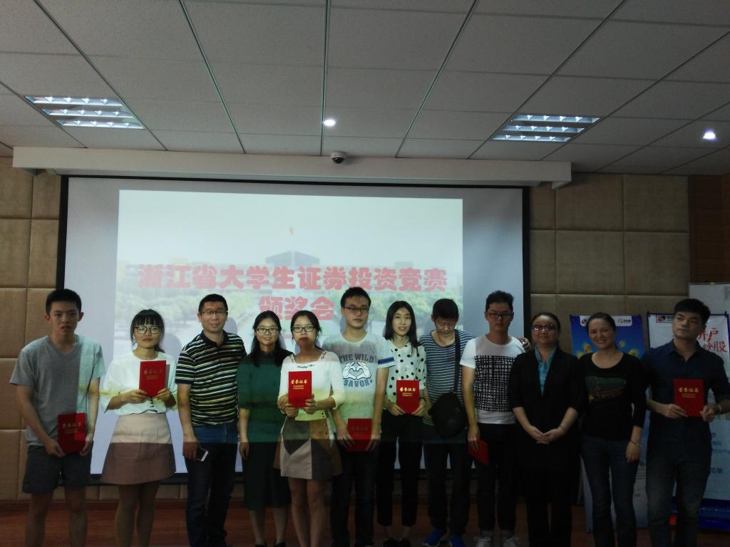 浙江省“同花顺杯”大学生证券投资竞赛由浙江省教育厅、浙江省大学生科技竞赛委员会举办,本次竞赛由浙江省大学生证券投资竞赛委员会和浙江财经大学承办,金融系获得团队赛一、二、三等奖共计6项。其中,王朝晖老师指导的“白鹭基金”(成员:王雅萍、胡若尘、李子彤)获得团队赛一等奖;吴琛和周新苗老师共同指导的“超活力队”(成员:叶凯迪、金振雄、余宁、余慧勇、李杨杰)和“黑狗石鸭队”(成员:王平石、钟政亚、蒋伟鑫、汪星)获得团队赛二等奖;熊乐星老师指导的“犇犇队”(成员:沈贤平、汪赫、盛樱波、沈思杰、张晏忠)和“小小金融家”(成员:沈贤平、汪赫、盛樱波、沈思杰、张晏忠)以及胡育蓉老师指导的“证券小公举”(成员:张楚雯、杨夏怡、杜依琳、陈彦伊、应金滔)获得团队赛三等奖。
