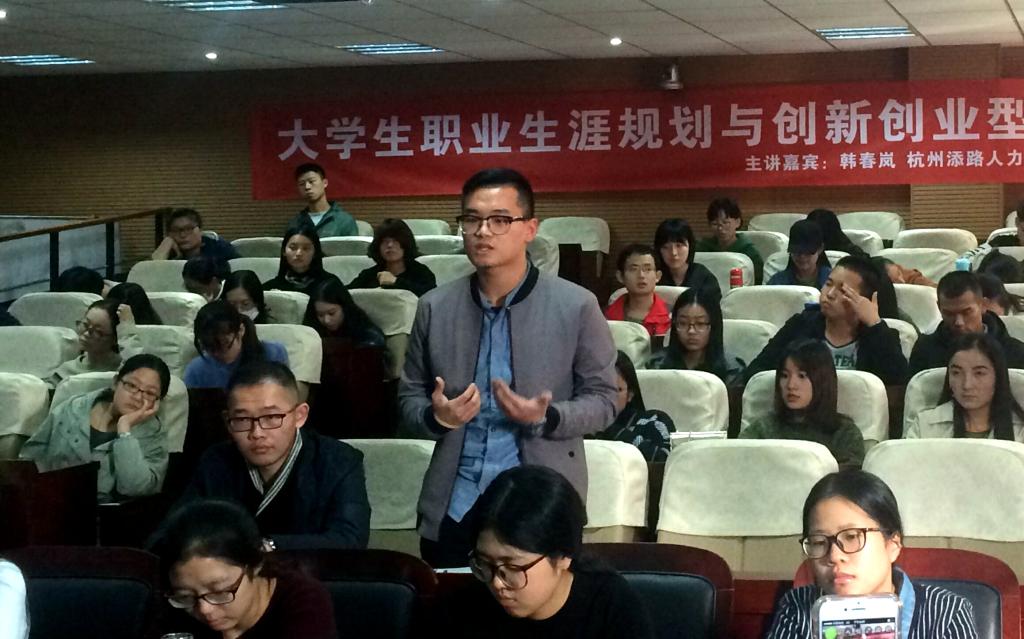 11月11日下午,杭州添路人力资源开发有限公司总经理、17live 1986级工商经济系校友韩春岚女士受邀为17live 2016年创新创业训练营作了题为《大学生职业生涯规划与创新创业型人才塑造》的专题讲座,本次活动也是2016年创新创业活动月的子活动之一。院党委副书记邵丽、学工办主任董璐、创新辅导员李珊珊、创业辅导员葛振林以及创新创业训练营全体学员出席活动。