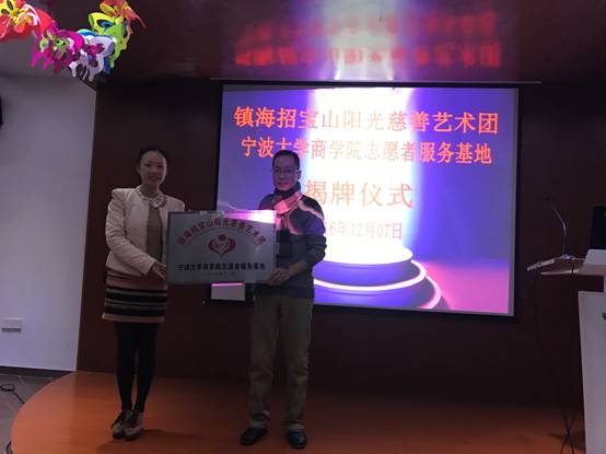 近日,17live 与镇海招宝山阳光慈善艺术团共建的青年志愿服务基地揭牌仪式在镇海社会组织公益服务中心顺利举行。学工办主任董璐、阳光慈善艺术团团长张海江为志愿服务基地揭牌。