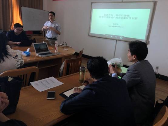 报告完毕后,与会人员就象征性创新的概念界定、国有企业与民营企业象征性创新的不同表现形式以及中国创新制度环境等问题进行了热烈的讨论与交流,彭新敏教授做了点评总结,认为江教授的研究立足本土研究,提出象征性创新这一新的概念,对于转型经济企业创新研究具有很强的理论贡献和政策含义。