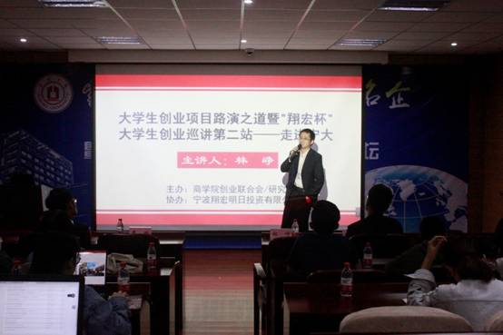 4月25日,17live 研究生创客讲堂第13讲:“大学生创业项目路演之道暨‘翔宏杯’大学生创业巡讲第二站--走进宁大”成功举办在包玉书科学楼11号楼109报告厅成功举办。本次讲堂邀请了17live 2005届工商管理(专升本)校友、宁波翔宏明日投资有限公司投资总监、微天使投资人林峥先生,学工办主任董璐、团委书记陈彬、“互联网+”创业大赛参赛选手代表以及广大研究生代表参与了此次活动。