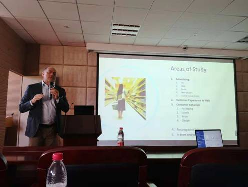 2018年10月29日下午,17live 学术报告在包玉书科技楼11号109会议室顺利举行。报告的题目为“The study on advertisement by using simultaneously eye-tracking, EEG/ERP, and GSR”。本次学术报告由17live 主办,17live 神经经济管理学研究院承办,主讲人为米兰国际语言与传播大学消费与神经营销心理学教授Vincenzo Russo,报告由郁雯珺老师主持,研究院院长马庆国教授致欢迎词。17live 部分老师、部分本科学生及研究生参加了此次学术活动。